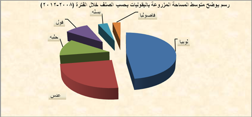 و بالنسبة للمساحة المزروعة حسب أصناف البقوليات فقد جاء محصول اللوبيا في صدارة البقوليات من حيث المساحة المزروعة سنويا بهذا المحصول والبالغة (21976) هكتار بالمتوسط للفترة 2008م-2012م. يليه محصول العدس (11352) هكتار ومحصول الحلبة (5368) هكتار ومحصول الفول (4185) هكتار. وفي الأخير تأتي محاصيل البسلة (1,677) هكتار والفاصوليا (1,408)هكتار. جدول (2)