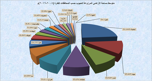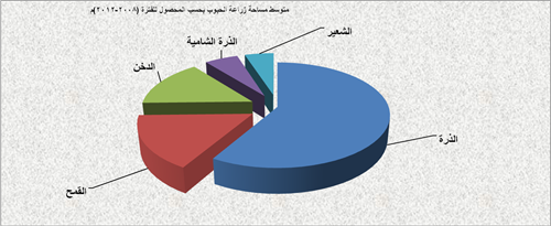 بالنسبة للمساحة المزروعة حسب أصناف الحبوب بالمتوسط فقد جاءت الذرة في صدارة الحبوب من حيث المساحة المزروعة سنويا بمقدار (467,222) هكتار يليها محصول القمح بمقدار (130,431) هكتار ثم محصول الدخن (117,746) هكتار ثم محصول الذرة الشامية (45,690) هكتار ثم محصول الشعير (39,859) هكتار. جدول(2)