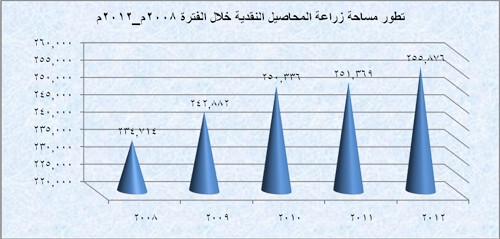 أخذت المساحة المزروعة للمحاصيل النقدية خلال الفترة (2008-2012)م تتجه نحو الزيادة من سنة إلى أخرى حيث تأتي المحاصيل النقدية في المرتبة الثانية من حيث المساحة المزروعة وبنسبة(17.3%) من إجمالي المساحة المزروعة في الجمهورية اليمنية , حيث يصل متوسط المساحة التي يتم زراعتها بمختلف أنواع المحاصيل النقدية سنوياً إلى (247035) هكتار ، وتعود هذه الزيادة في مساحة زراعة المحاصيل النقدية إلى التوسع الكبير في زراعة القات بسبب مردودة المادي السريع والكبير. جدول (1)