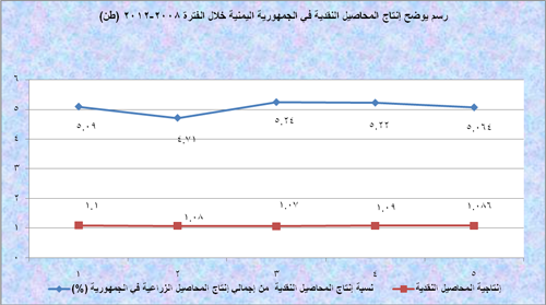 أخذ إنتاج المحاصيل النقدية اتجاه تصاعدي خلال الفترة (2008-2012)م، وتأتي المحاصيل النقدية في المرتبة الخامسة بين المحاصيل الزراعية في الجمهورية اليمنية من حيث الكمية المنتجة والتي تشكل نسبة (5.22%) في المتوسط من إجمالي إنتاج المحاصيل الزراعية في الجمهورية اليمنية , حيث وصل المتوسط السنوي للكمية التي يتم إنتاجها من مختلف المحاصيل النقدية(272839)طن . وفيما يتعلق بالإنتاجية نلاحظ أن متوسط إنتاج الهكتار السنوي من المحاصيل النقدية خلال نفس الفترة بلغ (1.086) طن /للهكتار الواحد, جدول(3) .