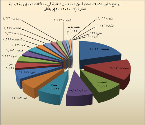 و بالنسبة للكميات المنتجة من المحاصيل النقدية بحسب المحصول للفترة (2008-2012)م فقد جاء محصول القات في صدارة المحاصيل النقدية من حيث متوسط كمية الإنتاج سنويا والبالغة (173,957) طن، يليه محصول السمسم (24,165) طن، و محصول القطن (23,298) طن، ومحصول التبغ (22,435)طن، وفي الأخير يأتي محصول البن (19,029) طن ومحصول الفول السوداني (1,678). جدول (4).