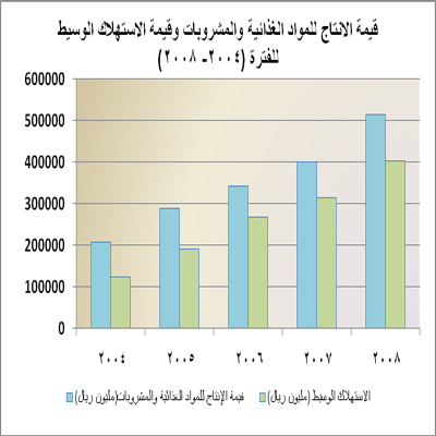 وتستحوذ الصناعات الغذائية على النسبة الأكبر من إجمالي إنتاج الصناعات التحويلية إذا ما تم استبعاد إجمالي إنتاج صناعة تكرير النفط والتي تشكل النسبة الأعلى في قيمة الإنتاج الصناعي التحويلي .ويوضح الجدول التالي قيمة الإنتاج والاستهلاك الوسيط للمواد الغذائية والمشروبات للفترة  (2004 – 2008)