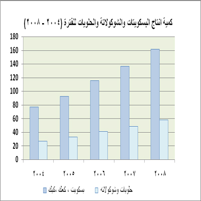 ويوضح الجدول التالي كمية البسكويتات والكعك والحلويات المنتجة في اليمن للفترة (2004 – 2008) – (بالألف طن)