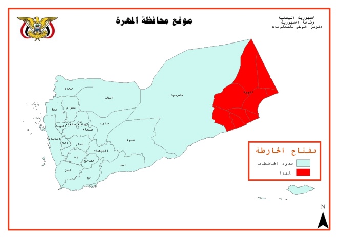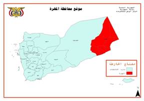 تقع محافظة المهرة إلى الشرق من العاصمة صنعاء، ويطلق عليها تسمية البوابة الشرقية لليمن، وتبعد عن العاصمة بحدود (1318) كيلو متراً، ويشكل سكانها ما نسبته (0.5%) من أجمالي سكان الجمهورية، ولذلك فهي تعد أقل المحافظات من حيث عدد السكان، وعدد مديرياتها (9) مديريات، ومدينة الغيظة مركز المحافظة. وتعد الزراعة وتربية الثروة الحيوانية وصيد الأسماك من أهم الأنشطة الرئيسة التي يمارسها سكان المحافظة، حيث يزرع فيها العديد من المحاصيل الزراعية، من أهمها الخضروات، تشكل المحاصيل الزراعية ما نسبته (0.42%) من إجمالي الإنتاج الزراعي في الجمهورية وكما تقع المحافظة على شريط ساحلي طويل يصل إلى (500) كيلو متر، غني بالأسماك والأحياء البحرية. ويوجد في أراضي المهرة موارد طبيعية وإمكانات اقتصادية متنوعة، إذ تشير المؤشرات الأولية إلى وجود بعض المعادن، من أهمها الذهب والرخام والجرانيت والرمال السوداء، وتشتهر محافظة المهرة بأشجار اللبان وصناعة البخور، ونشاط تجاري متميز كونها الشريان الرئيس لتجارة اليمن مع بعض دول الخليج العربي، ويشكل ميناء نشطون حركة تجارية في صيد وتصدير الأسماك. ومن معالمها السياحية محمية حوف. ويغلب على تضاريس المحافظة الطابع السهلي والصحراوي، ويتميز مناخها بأنه حار في فصل الصيف ومعتدل في فصل الشتاء.