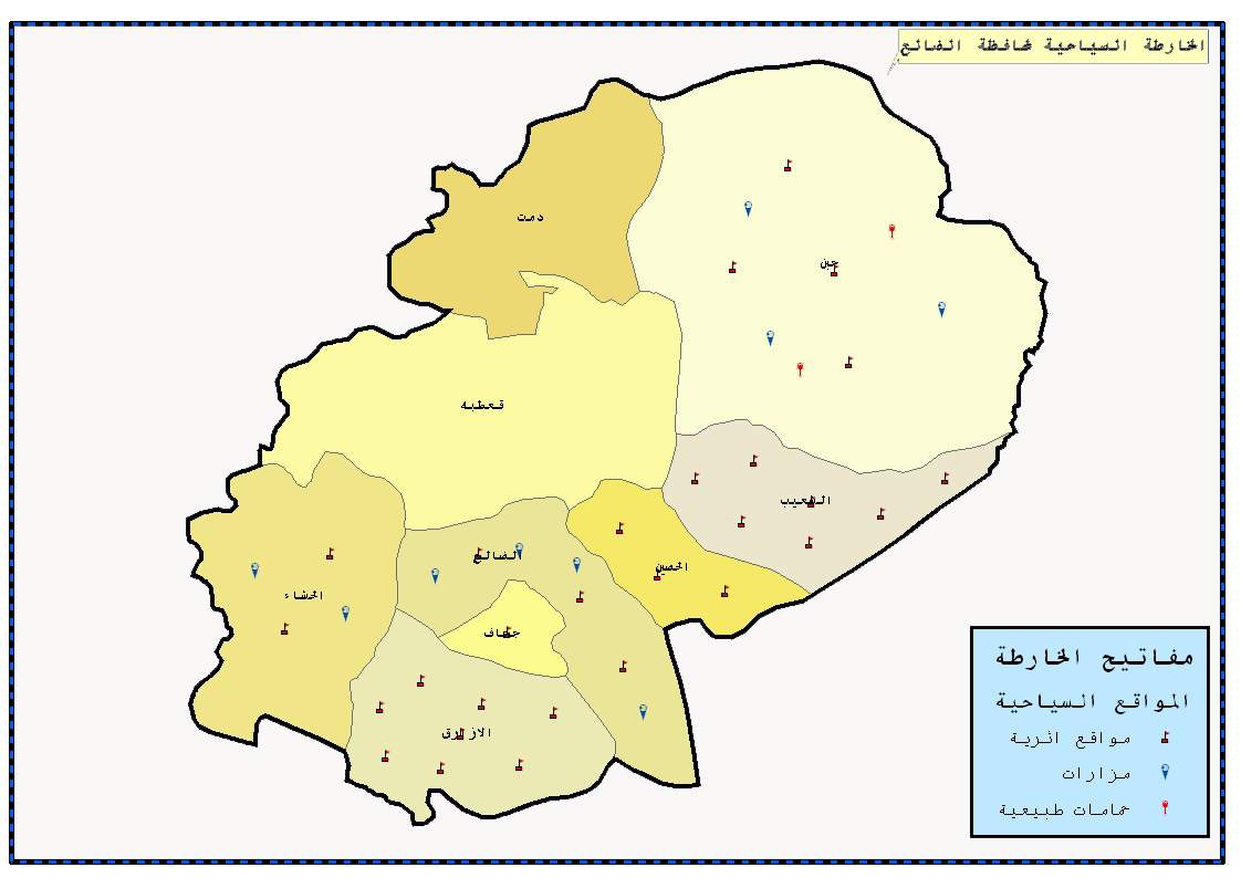 موقع المحافظة: تقع محافظة الضالع بين خط عرض( 42َ : 13ْ ) شمالاً ، وخط طول ( 43َ : 44ْ ) شرقاً ، و تبعد عن العاصمة صنعاء مسافة ( 245 كيلومتراً ) وتتصل المحافظة بمحافظتي أب والبيضاء من الشمال ، محافظتي البيضاء ولحج من الشرق، محافظة لحج من الجنوب، محافظتي إب وتعز من الغرب . المساحة: تبلغ المساحة حوالي(4099 ) كم2وتتوزع في تسع مديريات محافظة الضالع تعتبر استراحة تاريخية على دروب الأسفار وينابيع مياه شفائية وتميز في البنيان، تقع جنوب العاصمة صنعاء على بعد250 كيلومترا، فوق هضبة جبلية على الطريق الاسفلتي التي تربطها عبر ذمار على طريق لحج وعدن، تحيط بها وبالقرب منها عدد من المحافظات كالبيضاء وأبين ولحج وأب وتعز. يسود مناطق المحافظة مناخ صيفي معتدل وفي الشتاء يميل إلى البرودة ليلا، تتشكل التضاريس الطبيعية بين جبال وهضاب ووديان تضم أراضي خصبة. المناطق السياحية: مدينة الضالع: هي المركز الإداري، كانت تمر بها طريق القوافل القديمة التي تسير من عدن إلى صنعاء ويطل عليها جبل جحاف أشهر جبال المحافظة مع سلسلة جبال الحشا. منطقة دمت: تقع على مسافة 45 كيلومترا من يريم، وهي منطقة ينابيع معدنية للسياحة العلاجية تصل إلى 48 عينا، وانتعشت منطقة دمت سياحيا لموقعها على الطريق الإسفلتي وفي وادي بنا، خاصة بعد تحقق الوحدة اليمنية، ويتقاطر إليها يوميا كثير من المواطنين والزوار طلبا للاستشفاء وللاسترواح بطقس المنطقة المنعش، وفي دمت يمكن للزائر أن يشاهد معالم أثرية مثل جسر عامر بن عبد الوهاب الذي تنسب إليه العديد من الجسور والصهاريج والمساجد والمدارس. مدينة جبن: على بعد 55 كيلومترا من مدينة رداع و35 كيلومترا من قعطبة، وتعد أحلى أهم المدن التاريخية لسلاطين الدولة الطاهرية. المعالم الأثرية والتاريخية السياحية في المحافظة: مديرية الضالع (مدينة الضالع , قلعة دار الحيد , متحف الضالع , القباب والأضرحة) , مديرية جحاف (خزاعل) , مديرية الحشاء (جبل الحشاء , قرية المقدار , قرية الأكم – الرباط , قرى البيت ،النفيش، العسيل , قتر –قرضات , قلعة يارخ – مسجد بكر بن مبارك , مسجد النفيش, جبل النسور, مديرية الأزارق ( قرية الضبيات, دار العفيف, جامع سفيان ابن يوسف ,مسجد الضبيات , مسجد ثماد ), مديرية الحُصين (جبل عقرم) , مديرية الشعيب (قرية خلة ) , مديرية جُبن (مدينة جُبن , قلعة جُبن , قلعة قرين , المقرانة , المدرسة العامرية) , مديرية دمت (مدينة دمت , قلعة دمت, سد عامر بن عبد الوهاب , سور عامر بن عبد الوهاب , جسر عامر بن عبد الوهاب.
