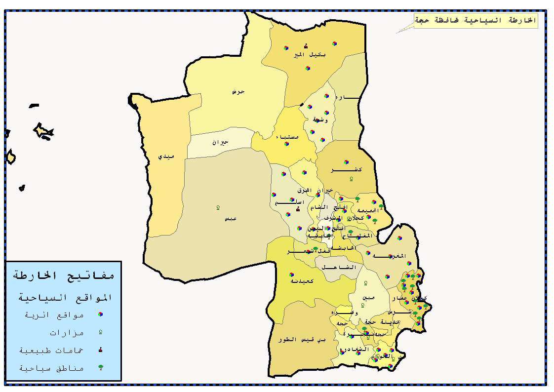 * شواهد آثار قديمة وإسلامية في مواقع الحصون والقلاع التاريخية. * أنماط معمارية متميزة في المحافظة تتمثل في المساجد والأضرحة والجسور. * ثروة طبيعية للسياحة البيئية المتمثلة في الوديان والغابات وأنواع من الطيور. * وجبال خضراء يتراوح ارتفاعها بين 2700م إلى 3000م كالحصون المنيعة، مثل كوكبان حجة والجاهلي ومبين، إلى جانب ثروة بيئية بحرية في جزيرة ذو حراب وجزيرة بكلان. * مدينة حجة: مركز المحافظة الواقعة على جبل متوسط الارتفاع 1800م من منسوب البحر. * قلعة القاهرة- كحلان عفار ومسور حجة، وهو أقرب إلى المدينة التي يكللها الحصن المنيع الذي يبلغ ارتفاعه 3050م وكل جبال حجة جاذبة للسياحة ومعظم مشارفها صالحة للطيران الشراعي، مثل جبال الشرفين ووشحة وكشر، يتخلل هذه الجبال وديان ومدرجات زراعية وقرى معلقة في المرتفعات العليا ذات طابع معماري مثير للدهشة.