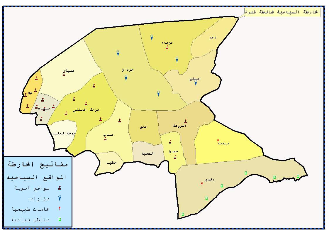 جذور الحضارة الأولى ومنطلق قوافل التجارة عبر طريق البخور على أرض شبوة قامت ثلاث ممالك، قتبان عاصمتها تمنع ثم أوسان عاصمتها مسورة، والدولة الثالثة هي حضرموت عاصمتها شبوة القديمة بمديرية عرمه. تقع شبوة شرق العاصمة صنعاء بمسافة 458 كيلومترا، وأعلى ارتفاع حوالي 3400 قدم عن سطح البحر، وتتوزع تضاريس المحافظة بين جبال ووديان وسهول وصحاري وبحر وكثير من المناطق فيها مخزونة بالثروات الطبيعية والتراثية. وتمتد بعض مناطقها شمالا باتجاه الربع الخالي وأخرى تطل على خليج عدن وتنتشر على امتداد الساحل عدد من قرى الصيد، أهمها بئر علي وحوراء وبلحاف ومصائدها غنية بالأحياء البحرية. مدن المحافظة التاريخية وشواهدها السياحية: مدينة عتق: عاصمة محافظة شبوه يوجد بها متحف يضم مجموعة قيمة من المعروضات الأثرية، وتتوفر بها المنشآت السياحية. مدينة بيحان: جميلة في مباني منازلها المتميزة من مادة الطين المخلوط بالتبن وهو أسلوب البناء الذي يسود المشرق من اليمن، وفي مدينة بيحان يوجد متحف يضم تشكيلة من اللقى القتبانية وأخرى من مواقع متفرقة من المحافظة. تمنع: عاصمة مملكة قتبان تقع على الضفة اليسرى لوادي بيحان على مشارف السهل الصحراوي على بعد 30 كيلومترا من بيحان وتسمى حاليا هجر كحلان، وقتبان مملكة ازدهرت في القرن الرابع قبل الميلاد. وتشير نتائج التنقيب أن تمنع كانت عامرة ذات ذهب وتراب ومعابد كثيرة، كما توجد مسلة عليها قوانين قتبانية، ومن مواقعها الأثرية هجر بن محمد وحيدر بن عقيل. ومن أهم المواقع بئر علي وميناء قنا، يبعد الموقع القديم للميناء 120 كيلومترا من المكلا و200 كيلومترا من عتق، وقنا الميناء الرئيسي لتجارة اللبان والطيوب الأخرى. ويوجد تل بركاني عرف بحصن الغراب. حمامات معدنية: كما تزخر المحافظة بإمكانيات سياحية طبيعية أخرى كالسياحة العلاجية في مياه حارة كبريتية والسياحة الشاطئية.