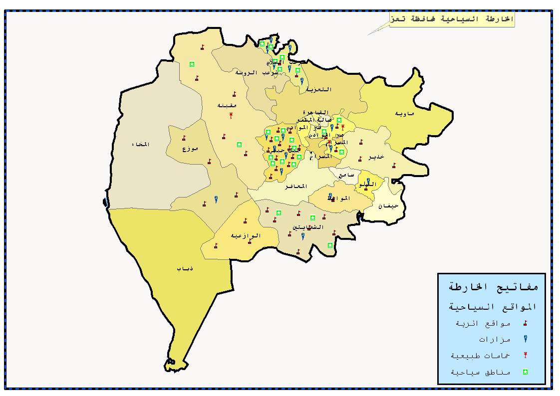 تمتلك محافظة تعز العديد من المناظر الطبيعية الساحرة ،فهناك الجبال والسهول والأودية الخضراء والمتنفسات الطبيعية والتنوع البيئي النباتي والحيواني والشواطئ الجميلة والحمامات الطبيعية والعلاجية.
